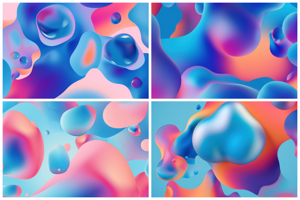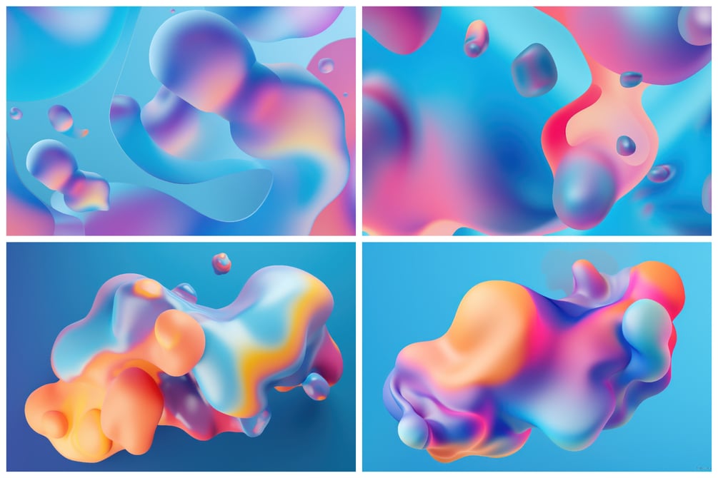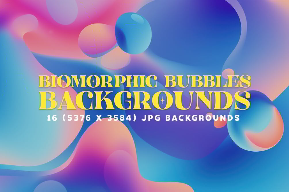 Immerse yourself in a collection of 16 meticulously crafted backgrounds, where vibrant and iridescent biomorphic bubbles come to life, floating in an ethereal realm.