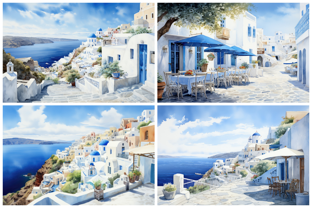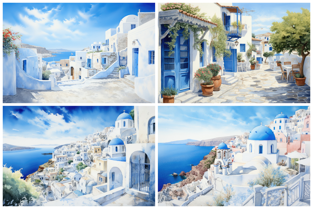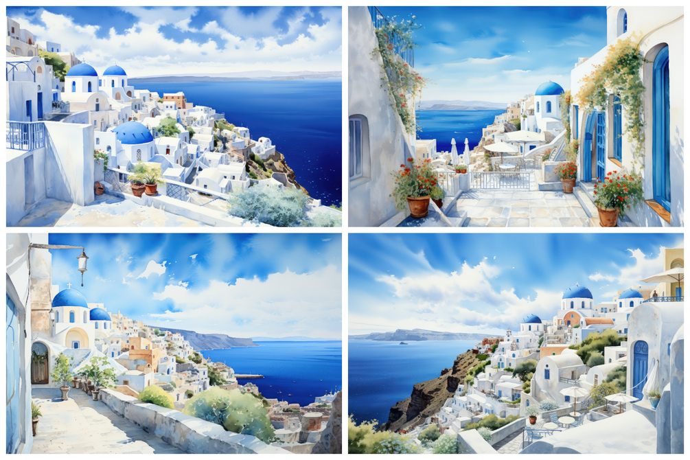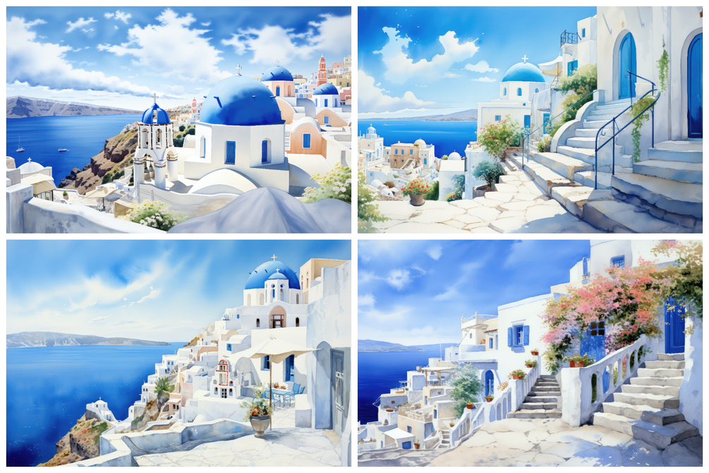 Immerse yourself in a virtual voyage across the tranquil Mediterranean, where each of the meticulously crafted 5K illustrations encapsulates the idyllic charm of Greece's iconic islands.