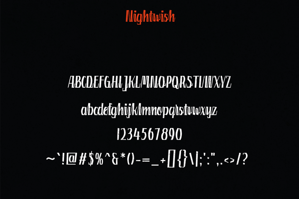 Nightwish is a sharp script typeface. The font is a bit slanted as if it's handwritten. Its gothic/Old English aesthetic is ideal for apparel, greeting cards, product packaging, book covers, album covers, logos, social media, posters, and more. If your design requires an aggressive vibe, then Nightwish should definitely be on your radar.