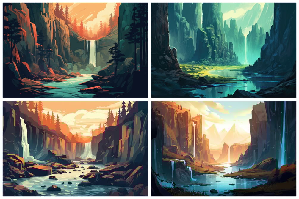 Embark on an awe-inspiring journey through nature's most breathtaking wonders with our collection of 16 Waterfall Landscape Illustrations. Immerse yourself in the raw power and ethereal beauty of cascading waters as they plunge from majestic heights, creating a symphony of sound and a spectacle for the senses.