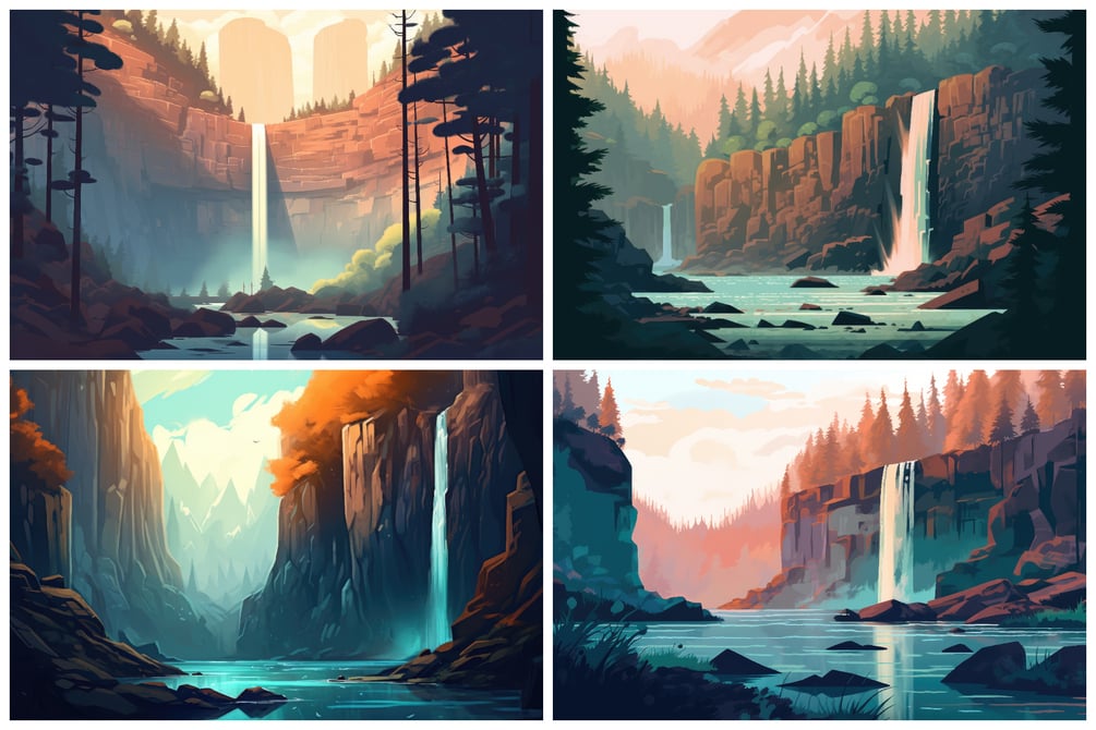 Each illustration captures the essence of nature's mastery, with crystal-clear waters shimmering in the sunlight, lush foliage framing the scene, and mist dancing in the air. From tranquil streams meandering through verdant forests to thundering torrents that command attention, these artworks transport you to a world where serenity and dynamism coexist in perfect harmony.
